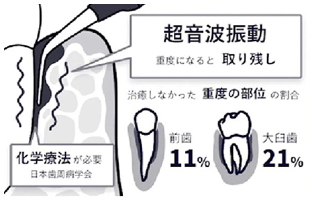従来の治療では、超音波スケーラーを用いて歯の表面に付着した歯石やプラークを物理的に取り除き、水で洗浄する方法が採られてきました。しかし、器具が届かない深部の歯周ポケット内には細菌が残りやすく、治癒が難航することもありました。そのようなケースでは、歯ぐきに抗生剤を注入する化学療法や、歯肉を切開して歯根を直接清掃する外科処置が必要になります。 ただし、化学療法では耐性菌のリスク、外科処置では痛みや回復期間の長さといった負担が伴います。
