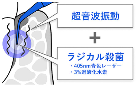 3%過酸化水素水と405nmの青色レーザーを組み合わせることで「ヒドロキシラジカル」を生成し、強力な酸化作用により歯周ポケット内の細菌を99.99%除菌します。